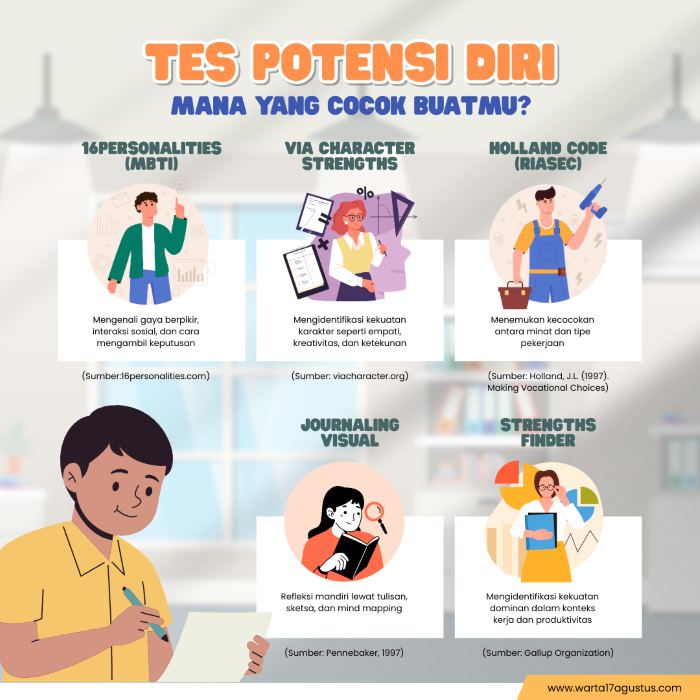 Tes kepribadian, journaling, atau diskusi dengan mentor bisa menjadi langkah awal. Namun, hasil tes bukan tujuan akhir, melainkan pijakan untuk terus bergerak.